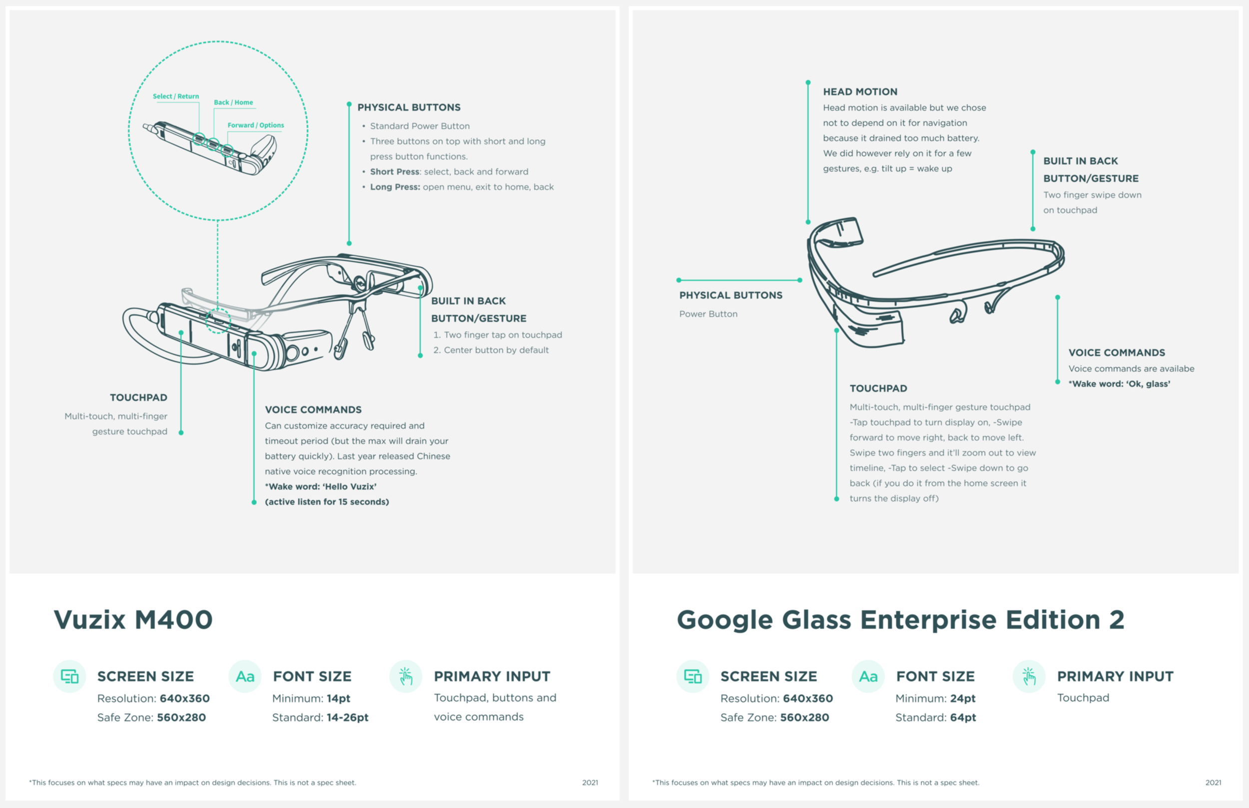 For the past three years, my teammate Maddie and I have worked on deploying our legacy and current product across various form factors – mobile, web, desktop, monocular wearables and binocular AR glasses. Looking at monocular devices specifically, we’ve had the chance to optimize for Epson, GG1, Google Glass Enterprise Edition 2, Vuzix M300, M400 and the RealWear HMT-1. These glasses represent a range of size and interaction paradigms.