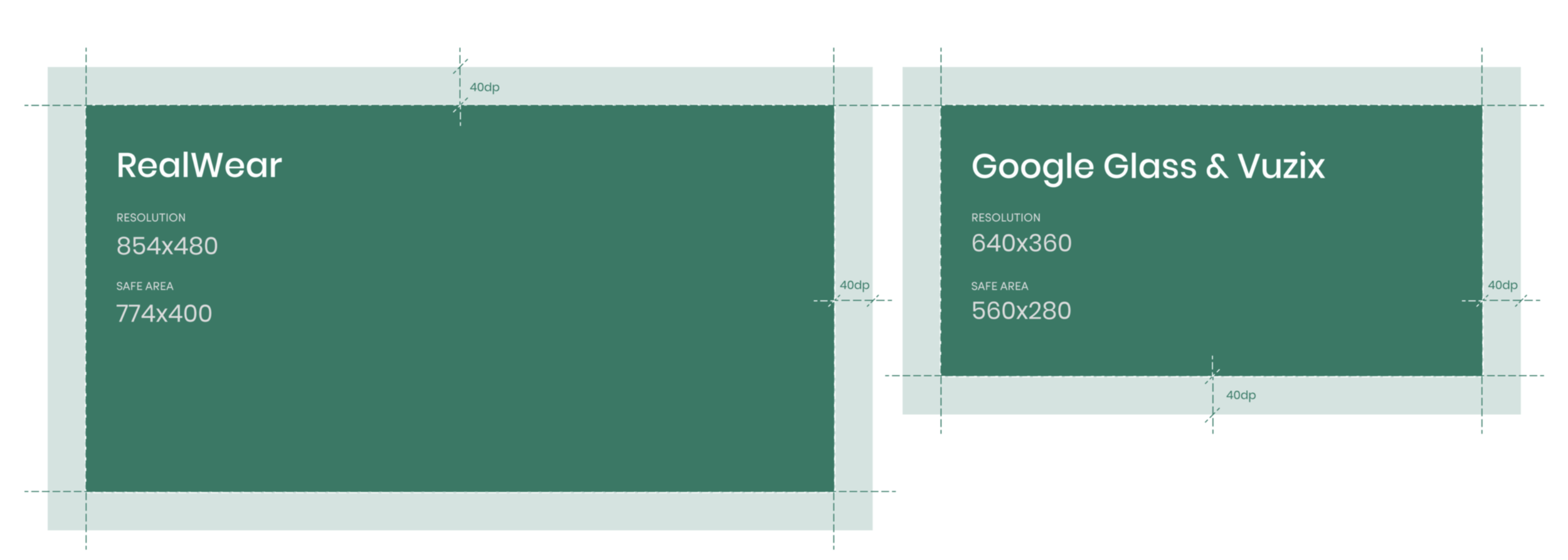 The screen size of the Vuzix M400 and Google Glass Enterprise Edition 2 are much smaller than the RealWear HMT-1. RealWear is larger at 854x480 and has a safe area of 774x400, whereas the Google Glass 2 and Vuzix have a display area of 640x360px (although guidelines suggest you have 40px of padding along the entire edge — so usable space can be as small as 560x280px). For these smaller devices, font size, UI components and labels need to be minimized as much as possible, while still maintaining accessibility. It’s helpful to drop your mobile screen components into an artboard or canvas to get a sense of the scale you’re dealing with. See device sizes in Figma.